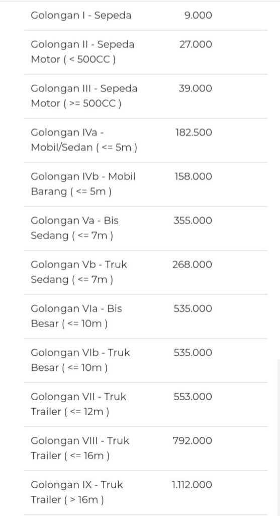 Harga tiket kendaraan dibagi berdasarkan golongan untuk memastikan keadilan ruang di dalam kapal: